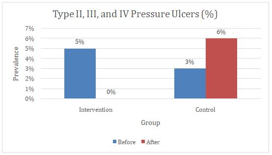 After one year, the intervention was administered to the intervention group and the incidence of PU dropped from 5% to 0%. During this same time, the incidence of PU actually increased in the Control group from 3% to 6%.